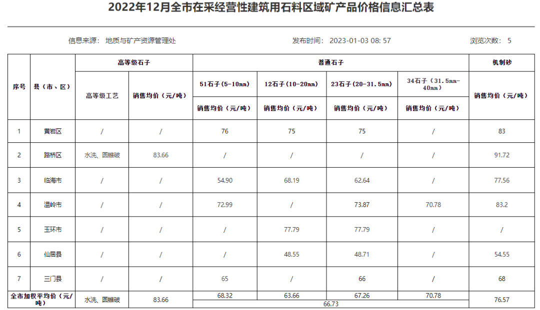 近日,浙江省臺(tái)州市人民政府發(fā)布“2022年12月全市在采經(jīng)營性建筑用石料區(qū)域礦產(chǎn)品價(jià)格信息匯總表”中顯示,12月浙江臺(tái)州砂石價(jià)格均出現(xiàn)不同程度的下跌,機(jī)制砂均價(jià)76.57元/噸,精品石子均價(jià)83.66元/噸,碎石均價(jià)66.73元/噸。其中51石子(5-10mm)均價(jià)68.32元/噸,12石子(10-20mm)均價(jià)63.66元/噸,23石子(20-31.5mm)均價(jià)70.28元/噸。