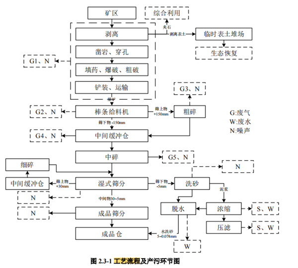 另外,該項(xiàng)目礦山擬采用露天開采方式,公路開拓,汽車運(yùn)輸,自上而下分臺(tái)階開采,臺(tái)階高度15m,深孔爆破,機(jī)械鏟裝。礦山東北側(cè)布置破碎站,開采的原礦石經(jīng)破碎加工后形成相應(yīng)粒徑的建筑石料,在采礦生產(chǎn)過程中采取濕式作業(yè)和灑水等抑塵措施。