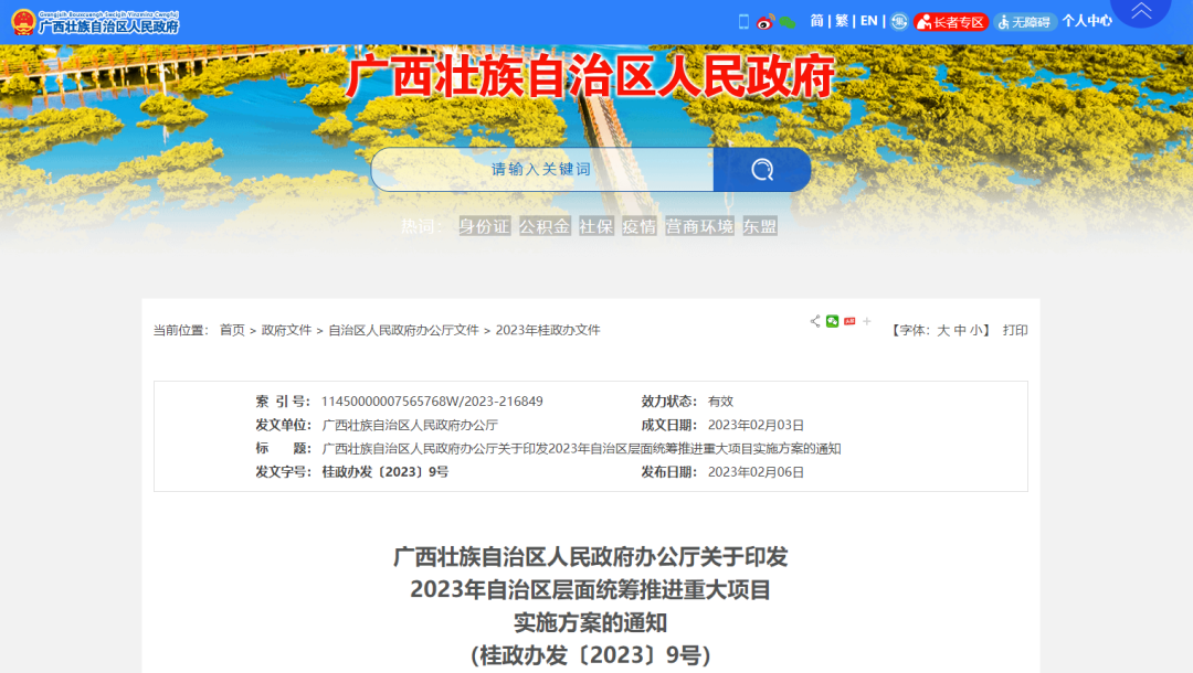 廣西壯族自治區(qū)政府辦公廳發(fā)布《2023年自治區(qū)層面統(tǒng)籌推進(jìn)重大項(xiàng)目實(shí)施方案》。方案提出,廣西2023年重大項(xiàng)目共2528項(xiàng),總投資46486.42億元,年度計(jì)劃投資4261.67億元。