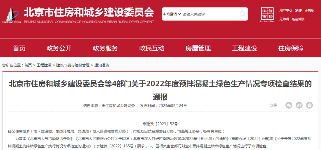 近日,北京市住房和城鄉(xiāng)建設委員會網站刊登北京市住房和城鄉(xiāng)建設委員會等4部門關于2022年度預拌混凝土綠色生產情況專項檢查結果的通報 京建發(fā)〔2023〕52號。