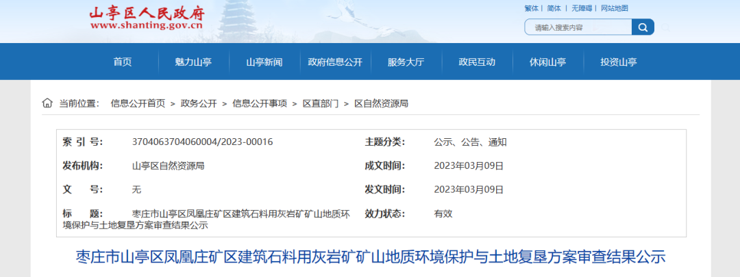 2023年3月9日,山東省棗莊市山亭區(qū)鳳凰莊礦區(qū)年產(chǎn)1150萬噸建筑石料用灰?guī)r礦地質(zhì)環(huán)境保護(hù)與土地復(fù)墾方案通過評審。