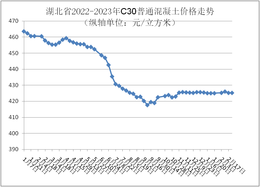 監(jiān)測(cè)數(shù)據(jù)顯示:2月份,強(qiáng)度等級(jí)C30普通混凝土全省均價(jià)為425.46元/立方米,環(huán)比上漲0.10%,同比下跌7.15%。