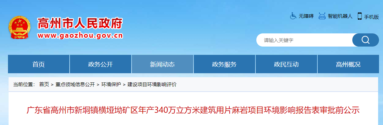 廣東省高州市新垌鎮(zhèn)橫埡坳礦區(qū)年產(chǎn)340萬(wàn)立方米建筑用片麻巖項(xiàng)目環(huán)境影響報(bào)告表審批前公示