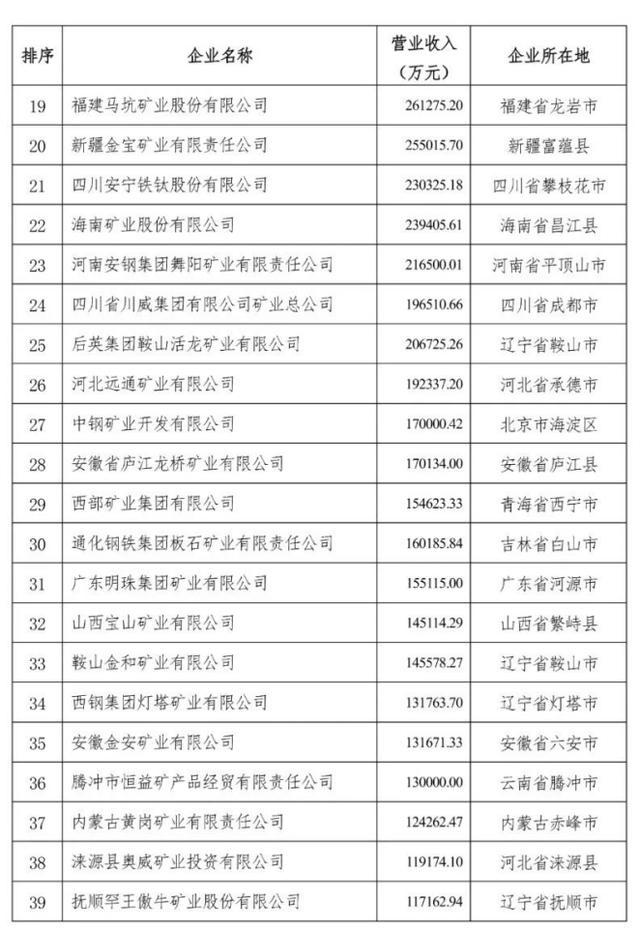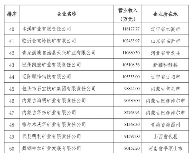 據(jù)排行榜顯示,寶武資源有限公司以359.41億元營(yíng)收蟬聯(lián)榜單第一名,鞍鋼集團(tuán)礦業(yè)公司和太原鋼鐵集團(tuán)礦業(yè)分公司位列榜單第二三位。營(yíng)業(yè)收入達(dá)百億以上的有八家,分別為寶武資源有限公司、鞍鋼集團(tuán)礦業(yè)有限公司、太原鋼鐵(集團(tuán))有限公司礦業(yè)分公司、首鋼集團(tuán)有限公司礦業(yè)公司、河北鋼鐵集團(tuán)礦業(yè)有限公司、本溪鋼鐵(集團(tuán))礦業(yè)有限責(zé)任公司、攀鋼集團(tuán)礦業(yè)有限公司、南方錳業(yè)集團(tuán)有限責(zé)任公司。