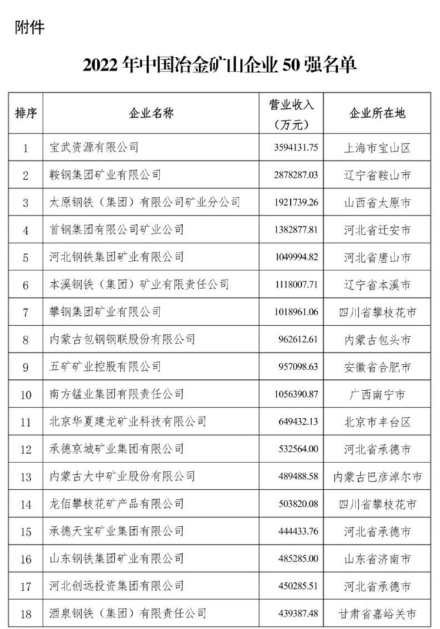 近日,中國(guó)冶金礦山企業(yè)協(xié)會(huì)以各冶金礦山企業(yè)2021年?duì)I業(yè)收入為主要依據(jù),排出了2022年中國(guó)冶金礦山企業(yè)50強(qiáng)。上榜的50強(qiáng)企業(yè)合計(jì)營(yíng)業(yè)收入達(dá)2465.51億元,比上年增加了784.54億元,年增幅高達(dá)46.6%。