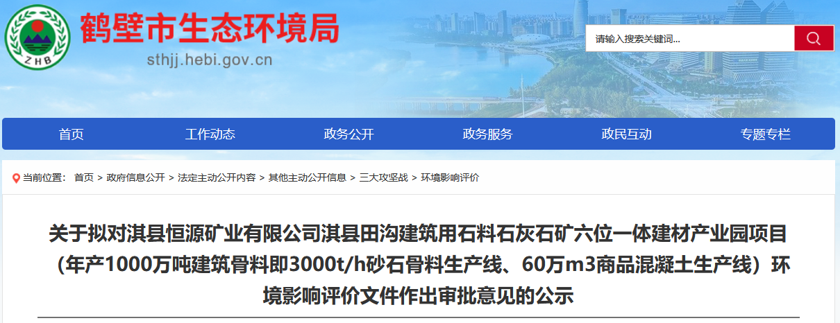 近日,河南鶴壁市生態(tài)環(huán)境局發(fā)布擬對(duì)淇縣恒源礦業(yè)有限公司淇縣田溝建筑用石料石灰石礦六位一體建材產(chǎn)業(yè)園項(xiàng)目(年產(chǎn)1000萬(wàn)噸建筑骨料即時(shí)產(chǎn)3000砂石骨料生產(chǎn)線、60萬(wàn)方商品混凝土生產(chǎn)線)環(huán)境影響評(píng)價(jià)文件作出審批意見(jiàn)的公示。