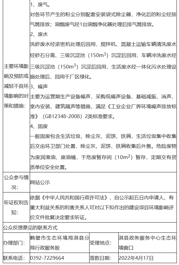 近日,河南鶴壁市生態(tài)環(huán)境局發(fā)布擬對(duì)淇縣恒源礦業(yè)有限公司淇縣田溝建筑用石料石灰石礦六位一體建材產(chǎn)業(yè)園項(xiàng)目(年產(chǎn)1000萬(wàn)噸建筑骨料即時(shí)產(chǎn)3000砂石骨料生產(chǎn)線、60萬(wàn)方商品混凝土生產(chǎn)線)環(huán)..