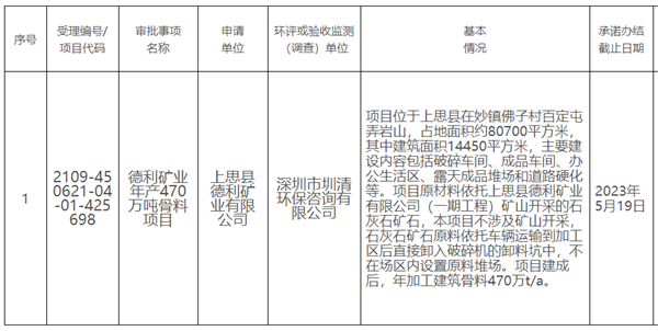 日前,廣西防城港市上思生態(tài)環(huán)境局對德利礦業(yè)年產470萬噸骨料項目進行環(huán)評公示。該項目位于廣西防城港市上思縣妙鎮(zhèn)佛子村百定屯弄巖山,不涉及礦山開采。其原材料依托德利礦業(yè)石灰石礦,原料依托車輛運輸?shù)郊庸^(qū)后直接卸入破碎機的卸料坑中,不在場區(qū)內設置原料堆場。