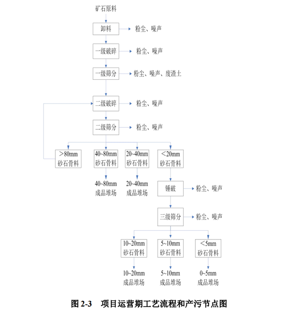 據(jù)悉,該項目的破碎、篩分設置主要是石灰石礦經振動給料機送入下方顎式破碎機進行一級破碎,再進入一級篩分,篩出礦石中夾雜的泥土,經一級篩分后的礦石再進入反擊式破碎機進行二級破碎,對二級破碎后的物料進行二級篩分,二級篩分后分別得到>80mm、40~80mm、20~40mm和<20mm的篩余物,其中40~80mm和20~40mm篩余物為成品骨料,分別通過皮帶傳送進入40~80mm的成品堆場堆放和20~40mm的成品堆場堆放,>80mm的篩余物經皮帶運輸至反擊式破碎機進行再次破碎,<20mm的篩余物再進入錘破機錘破,再經過三級篩分最后分別得到10~20mm、5~10mm和0~5mm成品骨料。