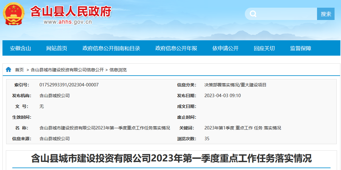 近日,安徽省馬鞍山市含山縣城投公司發(fā)布含山縣城市建設(shè)投資有限公司2023年第一季度重點(diǎn)工作任務(wù)落實(shí)情況。