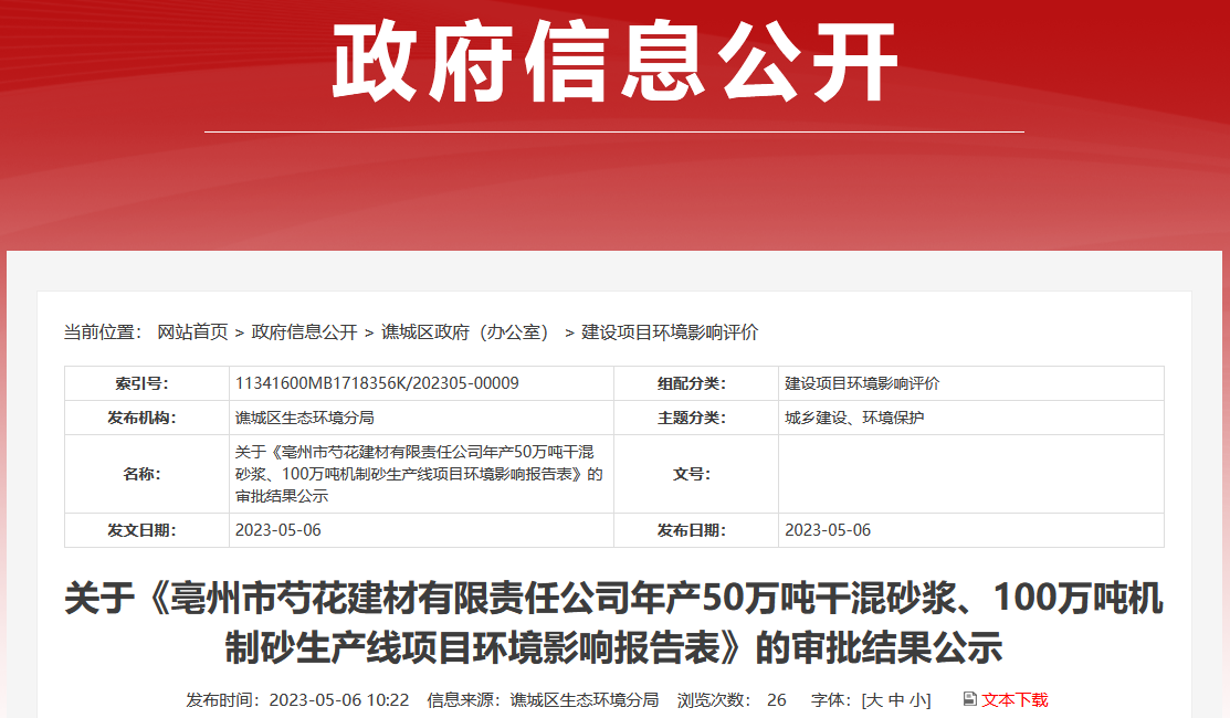 2023年5月6日,《亳州市芍花建材有限責(zé)任公司年產(chǎn)50萬噸干混砂漿、100萬噸機(jī)制砂生產(chǎn)線項目環(huán)境影響報告表》通過環(huán)評審批,現(xiàn)審批結(jié)果有關(guān)情況公示如下: