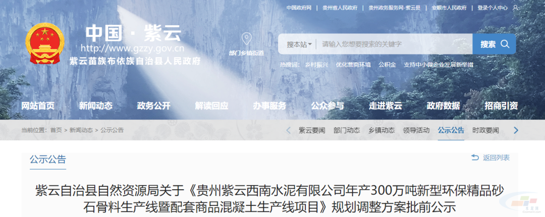 近日,貴州省紫云自治縣自然資源局發(fā)布關(guān)于《貴州紫云西南水泥有限公司年產(chǎn)300萬噸新型環(huán)保精品砂石骨料生產(chǎn)線暨配套商品混凝土生產(chǎn)線項(xiàng)目》規(guī)劃調(diào)整方案批前公示。
