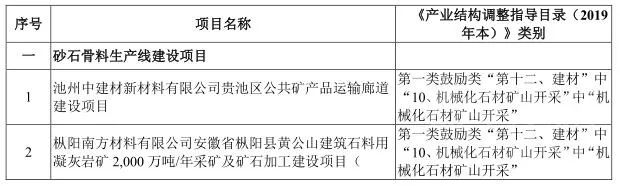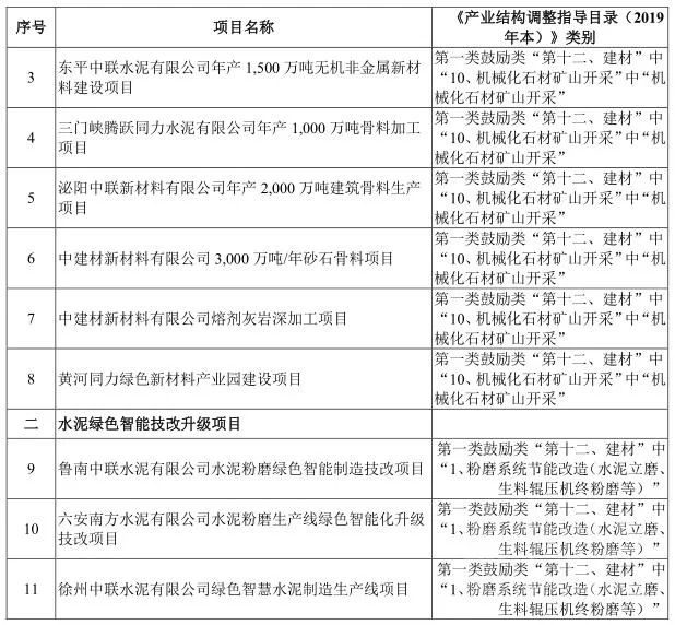 本次募投項目中砂石骨料項目、活性石灰項目符合《產(chǎn)業(yè)結(jié)構(gòu)調(diào)整指導(dǎo)目錄(2019年本)》第一類鼓勵類“第十二、建材”中“10、機械化石材礦山開采”中“機械化石材礦山開采”的范疇,為鼓勵類項目;本次募投項目中水泥綠色智能技改升級項目符合《產(chǎn)業(yè)結(jié)構(gòu)調(diào)整指導(dǎo)目錄(2019 年本)》第一類鼓勵類“第十二、建材”中“1、粉磨系統(tǒng)節(jié)能改造(水泥立磨、生料輥壓機終粉磨等)”,均是對原有水泥粉磨生產(chǎn)線進行綠色智能化技術(shù)改造或擴建,采取先進工藝,能夠有效降低能耗、減少污染,同樣為鼓勵類項目。因此,本次募投項目均投向《產(chǎn)業(yè)結(jié)構(gòu)調(diào)整指導(dǎo)目錄(2019 年本)》的“鼓勵類”領(lǐng)域,不涉及限制類、淘汰類項目,不存在需要取得主管部門意見的情形。