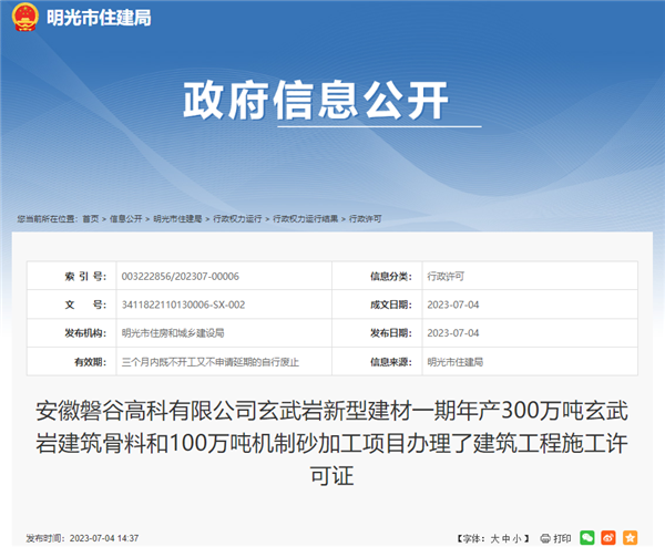 7月4日,安徽省滁州市明光市住建局發(fā)布消息,安徽磐谷高科有限公司玄武巖新型建材一期年產(chǎn)300萬(wàn)噸玄武巖建筑骨料和100萬(wàn)噸機(jī)制砂加工項(xiàng)目辦理了建筑工程施工許可證,或在近期開建。