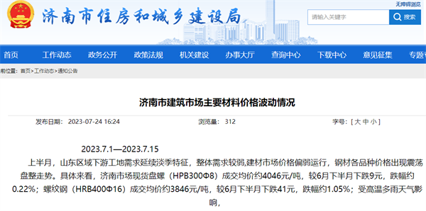 上半月,山東區(qū)域下游工地需求延續(xù)淡季特征,整體需求較弱,建材市場價格偏弱運行,鋼材各品種價格出現(xiàn)震蕩盤整走勢。水泥、商品混凝土市場需求下滑,價格持續(xù)下探,PO42.5散裝水泥較6月下半月下跌20元/噸;商品混凝土較6月下半月下跌15元/方;瀝青混凝土、商品砂漿市場穩(wěn)定,價格不變。