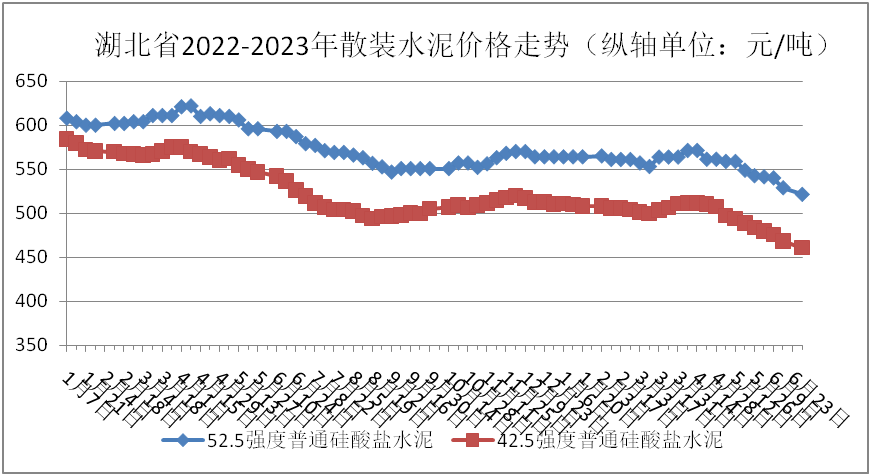 監(jiān)測數據顯示:6月份,42.5強度普通硅酸鹽水泥、42.5強度礦渣硅酸鹽水泥、52.5強度普通硅酸鹽水泥全省平均價格分別為:471.08元/噸、458.61元/噸、532.81元/噸,環(huán)比分別下跌:4.04%、5.74%、3.51%;同比分別下跌:11.96%、13.38%、9.85%。具體價格走勢情況如下圖: