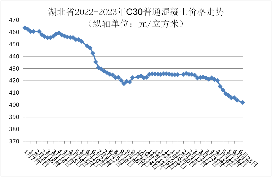 監(jiān)測數據顯示:6月份,強度等級C30普通混凝土全省均價為404.52元/立方米,環(huán)比下跌1.62%,同比下跌9.33%。