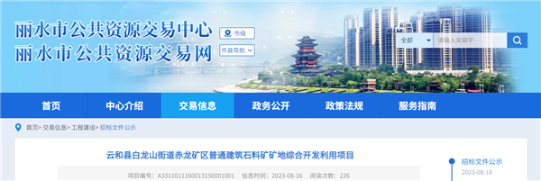 8月16日,浙江省麗水市公共資源交易中心發(fā)布云和縣白龍山街道赤龍礦區(qū)普通建筑石料礦礦地綜合開(kāi)發(fā)利用項(xiàng)目招標(biāo)文件公示公告,將于近期招標(biāo)。該項(xiàng)目建設(shè)總投資近12.3億元,年開(kāi)采規(guī)模1800萬(wàn)噸,招標(biāo)內(nèi)容包括礦山工程、霧溪河道整治工程、云霧路臨時(shí)改道工程及G25高速河上大橋橋下填方工程。施工總工期為1275個(gè)日歷天。