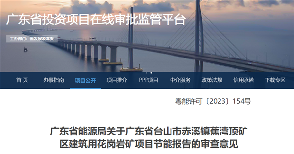 8月30日,廣東省發(fā)展和改革委員會(huì)發(fā)布關(guān)于中電建江門(mén)臺(tái)山赤溪鎮(zhèn)蕉灣頂?shù)V區(qū)建筑用花崗巖礦項(xiàng)目節(jié)能報(bào)告的審查意見(jiàn)。該項(xiàng)目投資60億元,設(shè)計(jì)年開(kāi)采花崗巖800萬(wàn)方,年產(chǎn)碎石1384萬(wàn)噸、機(jī)制砂590萬(wàn)噸。