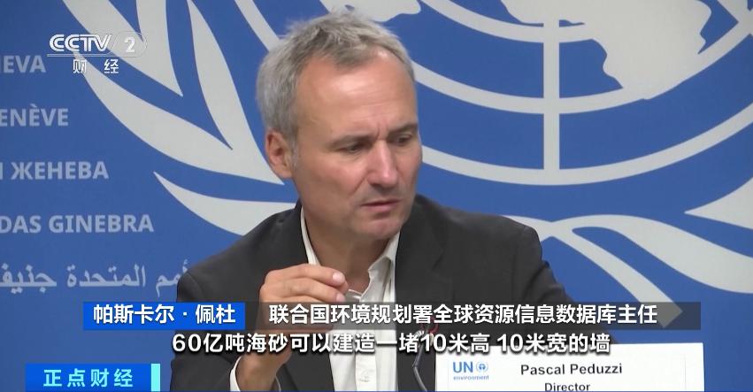 聯(lián)合國(guó)環(huán)境規(guī)劃署全球資源信息數(shù)據(jù)庫(kù)主任 帕斯卡爾·佩杜:60億噸海砂可以建造一堵10米高、10米寬的墻,足夠環(huán)繞地球一圈?;蛘呦喈?dāng)于全球80億人每人每天開(kāi)采2千克,每天可以裝滿100多萬(wàn)輛卡車。