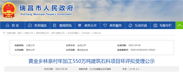 日前,江西省九江市瑞昌市人民政府發(fā)布一年加工550萬(wàn)噸建筑石料項(xiàng)目環(huán)評(píng)擬受理公示。該項(xiàng)目總投資40112.65萬(wàn)元(超4億元),施工工期6個(gè)月,建設(shè)單位為瑞昌市黃金鄉(xiāng)林泉村股份經(jīng)濟(jì)合作社。