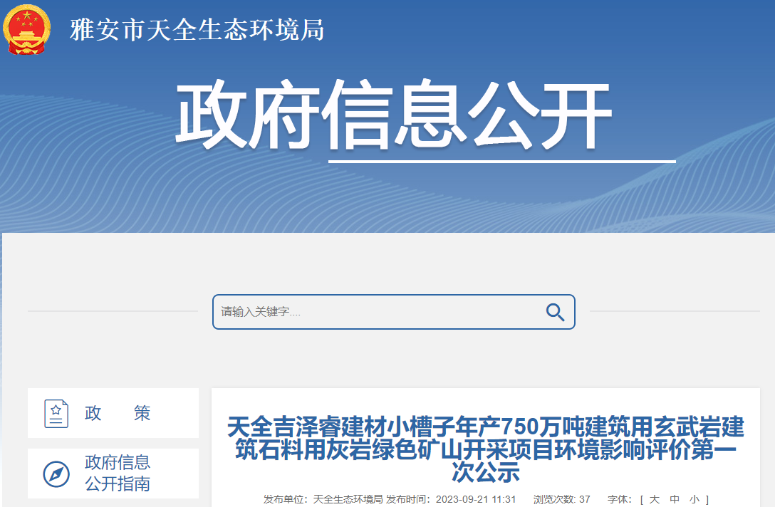 9月21日,四川雅安市天全生態(tài)環(huán)境局發(fā)布天全吉澤睿建材小槽子年產(chǎn)750萬噸建筑用玄武巖建筑石料用灰?guī)r綠色礦山開采項目環(huán)境影響評價第一次公示。