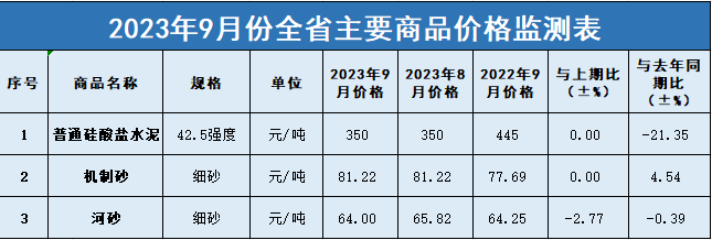 近日,據(jù)了解,甘肅省發(fā)布9月份及三季度砂石、水泥價格分析報告。9月份河砂價格環(huán)比同比均下降,環(huán)比下降2.77%;三季度砂石價格環(huán)比同比均上漲,其中,機制砂環(huán)比分別上漲3.85%。