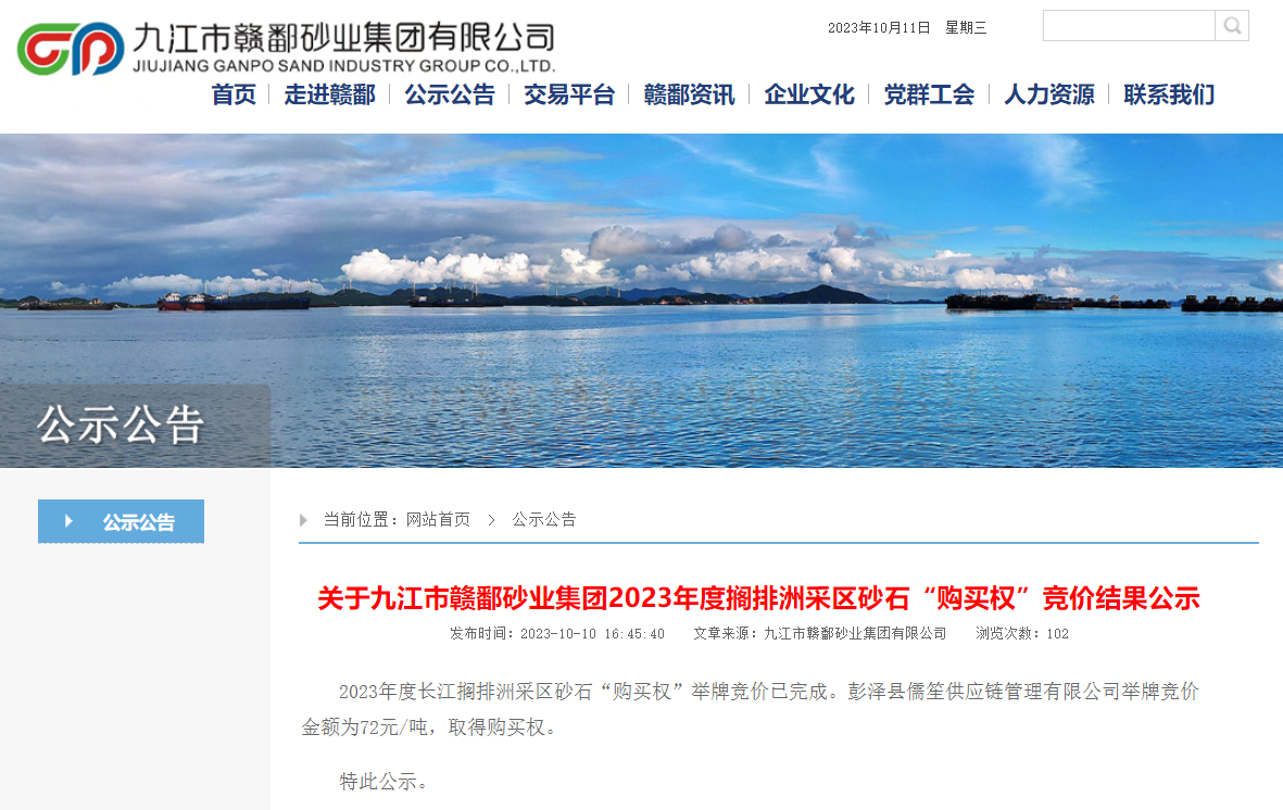 九江市贛鄱砂業(yè)集團(tuán)有限公司是九江市指定采砂許可的企業(yè),主要負(fù)責(zé)鄱陽湖九江水域和長(zhǎng)江九江段的水采砂石管理職能,根據(jù)企業(yè)發(fā)布的公示信息: