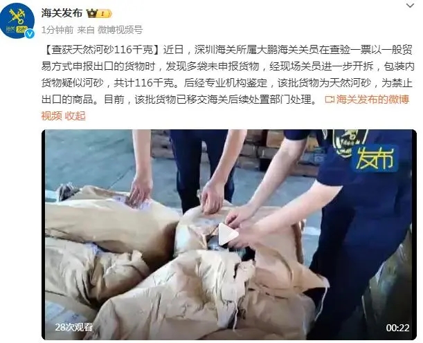 近日,深圳海關所屬大鵬海關關員在查驗一票以一般貿易方式申報出口的貨物時,發(fā)現(xiàn)多袋未申報貨物,經(jīng)現(xiàn)場關員進一步開拆,包裝內貨物疑似河砂,共計116千克。后經(jīng)專業(yè)機構鑒定,該批貨物..