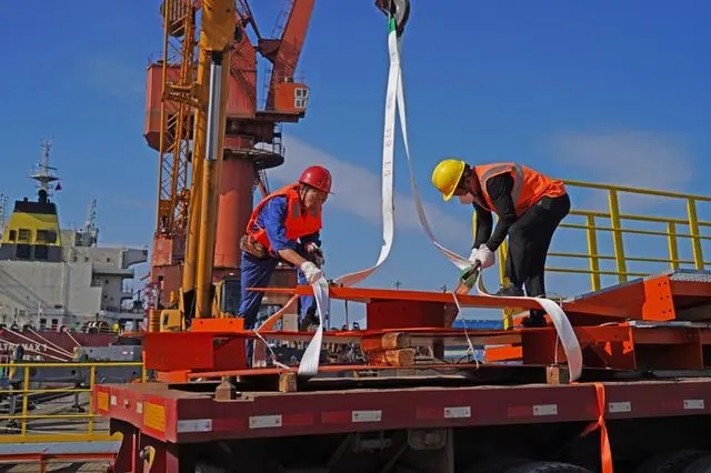工人通過吊機(jī)將堆取料機(jī)的零部件卸船進(jìn)場。項(xiàng)目部供圖