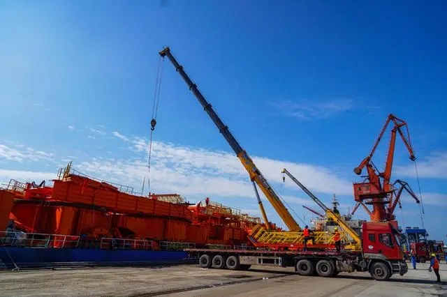 施工方正在將堆取料機(jī)零部件卸船進(jìn)場。項(xiàng)目部供圖