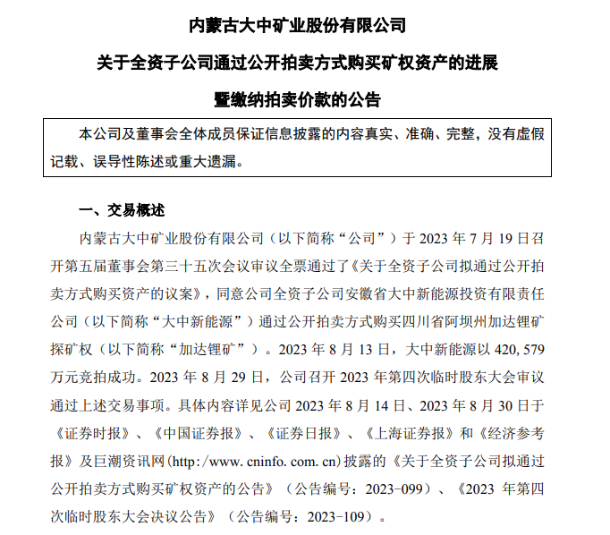 今年8月,大中礦業(yè)以42.06億的“天價(jià)”競(jìng)得四川加達(dá)鋰礦,令市場(chǎng)嘩然。拍賣(mài)過(guò)程持續(xù)了約4天,總計(jì)報(bào)價(jià)次數(shù)達(dá)到了1.1萬(wàn)余次,成交價(jià)較319萬(wàn)元的起始價(jià)升值了1317倍。