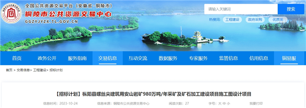 10月24日,安徽省銅陵市公共資源交易中心發(fā)布樅陽縣螺絲尖建筑用安山巖礦980萬噸/年采礦及礦石加工建設項目施工圖設計項目招標計劃,計劃招標時間2023年11月。招標人為安徽玄武新材料有限公司..