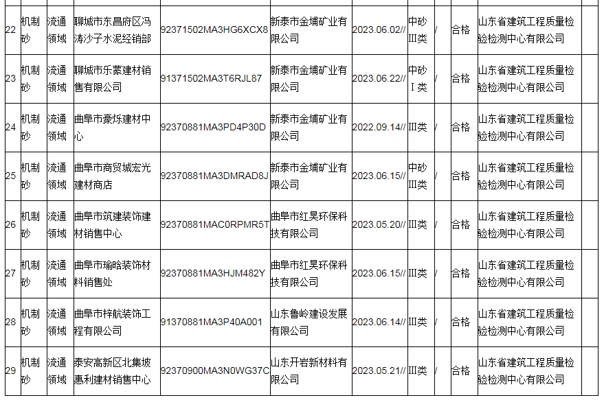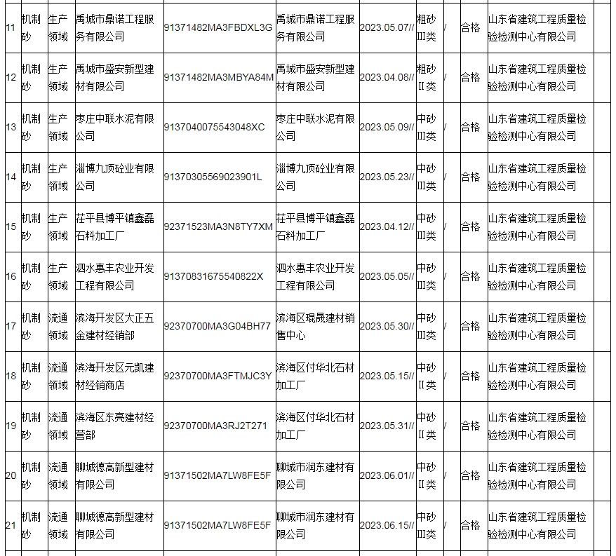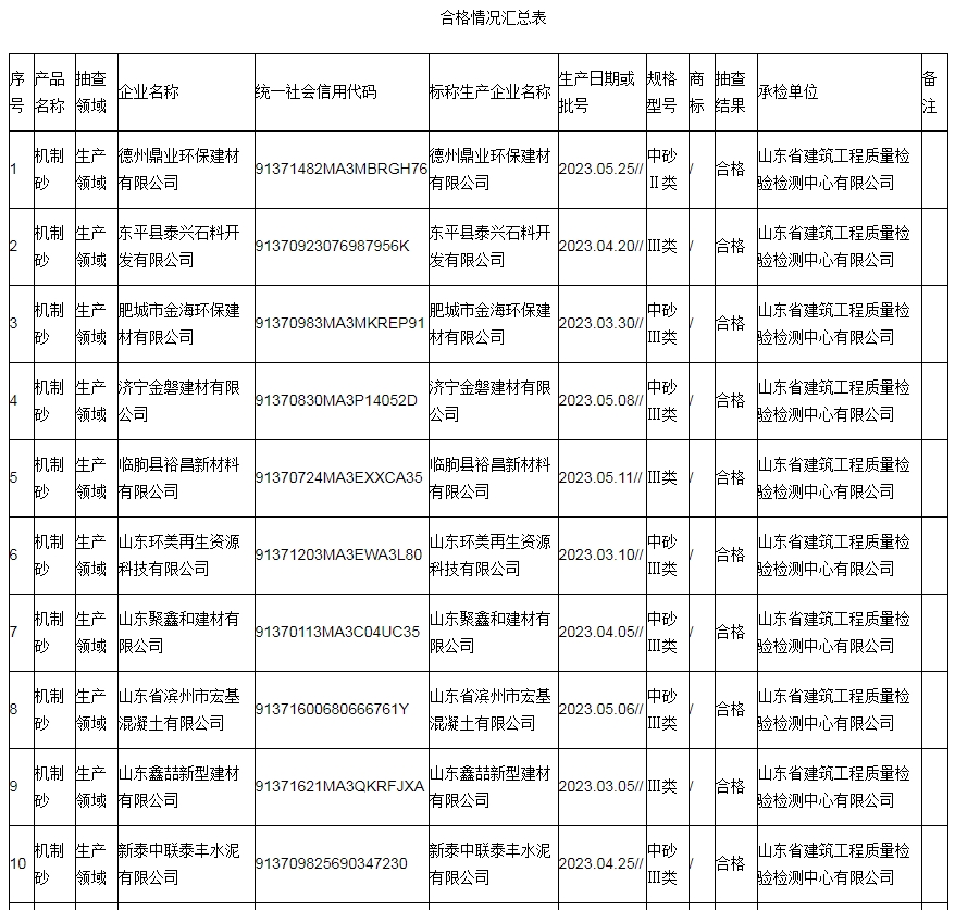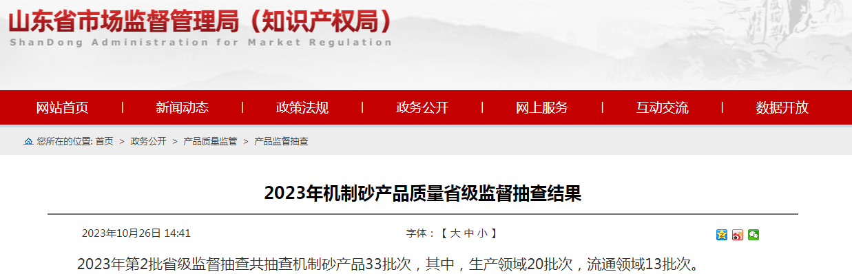 2023年10月26日,山東省市場(chǎng)監(jiān)督管理局網(wǎng)站發(fā)布2023年機(jī)制砂產(chǎn)品質(zhì)量省級(jí)監(jiān)督抽查結(jié)果。2023年第2批省級(jí)監(jiān)督抽查共抽查機(jī)制砂產(chǎn)品33批次,其中,生產(chǎn)領(lǐng)域20批次,流通領(lǐng)域13批次。