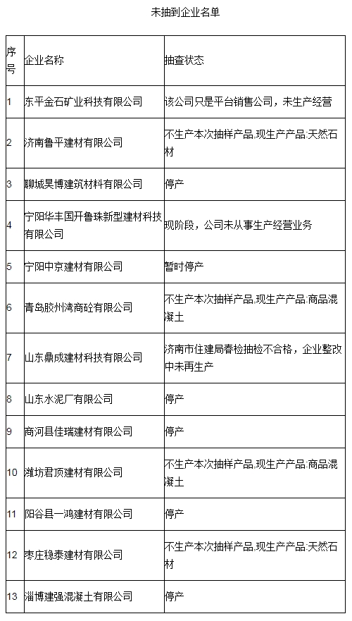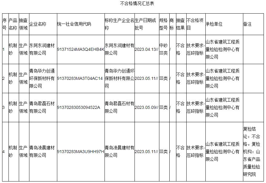 本次抽查發(fā)現(xiàn)青島君磊石材有限公司、青島凌晨建材有限公司、青島華力創(chuàng)通環(huán)保新材料有限公司、東阿東潤(rùn)建材有限公司共4家生產(chǎn)者的4批次產(chǎn)品不符合相關(guān)標(biāo)準(zhǔn)的要求,不合格項(xiàng)目為壓碎指標(biāo)項(xiàng)目。其中,生產(chǎn)者青島凌晨建材有限公司對(duì)檢驗(yàn)結(jié)果提出異議,并申請(qǐng)復(fù)檢;經(jīng)復(fù)檢,維持初檢結(jié)論。