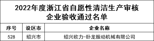 近日,浙江省經(jīng)濟(jì)和信息化廳公示了2022年度浙江省自愿性清潔生產(chǎn)審核企業(yè)名單,紹興歐力-臥龍振動(dòng)機(jī)械有限公司成功上榜。