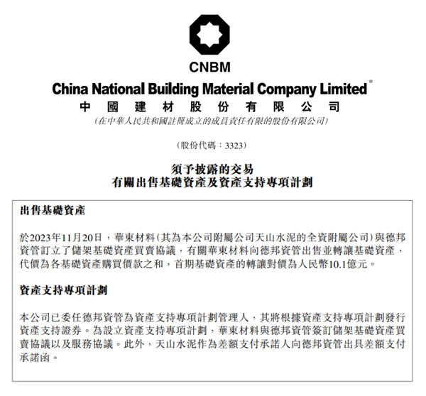日前,中建材發(fā)布公告稱,華東材料(其為本公司附屬公司天山水泥的全資附屬公司)與德邦資管訂立了儲架基礎(chǔ)資產(chǎn)買賣協(xié)議,有關(guān)華東材料向德邦資管出售并轉(zhuǎn)讓基礎(chǔ)資產(chǎn),代價為各基礎(chǔ)資產(chǎn)購買價款之和,首期基礎(chǔ)資產(chǎn)的轉(zhuǎn)讓對價為人民幣10.1億元。