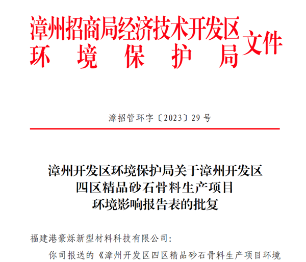 日前,福建港豪爍新型材料科技有限公司旗下年產(chǎn)400萬(wàn)噸砂石骨料項(xiàng)目環(huán)評(píng)獲批。該項(xiàng)目位于福建省漳州開發(fā)區(qū)四區(qū),總建筑面積約4620平方米,擬新建廠房2棟,建設(shè)2條碎石加工生產(chǎn)線,其中碎石骨料120萬(wàn)噸/年,機(jī)制砂280萬(wàn)噸/年。