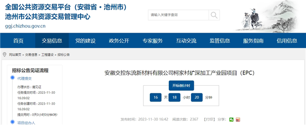 11月30日,安徽省池州市公共資源交易管理中心發(fā)布了安徽交控東流新材料有限公司柯家村礦深加工產(chǎn)業(yè)園項(xiàng)目EPC工程公開(kāi)招標(biāo)公告。項(xiàng)目招標(biāo)控制價(jià)超13.5億元,建設(shè)周期215天日歷天,投標(biāo)截止時(shí)間2023年12月21日9時(shí)。