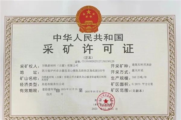 12月27日,蜀道鐵路投資集團(tuán)所屬新材料(古藺)公司成功取得古藺縣龍山鎮(zhèn)龍華建筑石料用灰?guī)r礦采礦許可證。