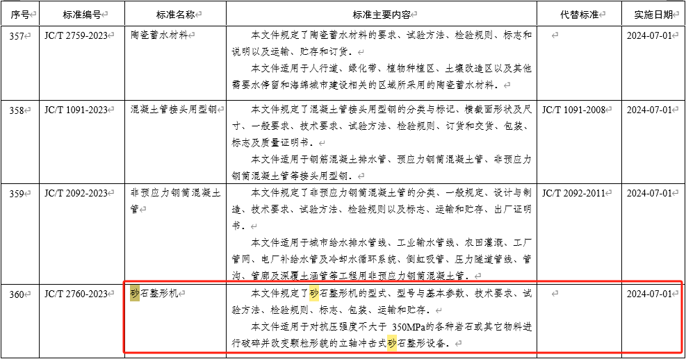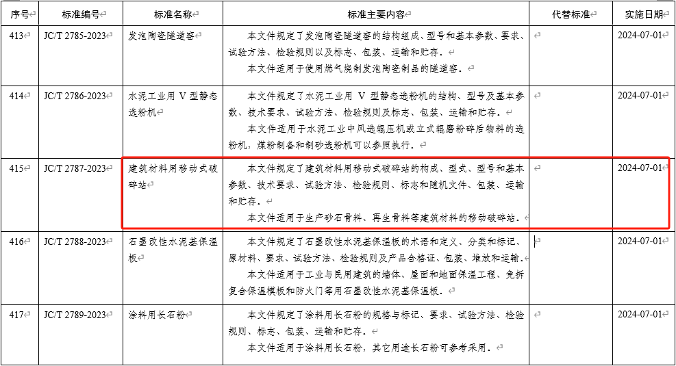 近日,工業(yè)和信息化部發(fā)布了《中華人民共和國工業(yè)和信息化部公告2023年第38號》,批準了《砂石整形機》、《建筑材料用移動式破碎站》等1276項行業(yè)標準,其中包括國家建筑材料工業(yè)機械標準化技術(shù)委員會歸口管理的JC/T 2760-2023《砂石整形機》、JC/T 2787-2023《建筑材料用移動式破碎站》、JC/T 720-2023《蒸壓釜》、JC/T 820-2023《水泥工業(yè)用空氣輸送斜槽》、JC/T 2785-2023《發(fā)泡陶瓷隧道窯》、JC/T 2786-2023《水泥工業(yè)用V型靜態(tài)選粉機》、JC/T 921-2023《蒸壓加氣混凝土設備 切割機組》建材機械行業(yè)標準,自2024年7月1日起實施。