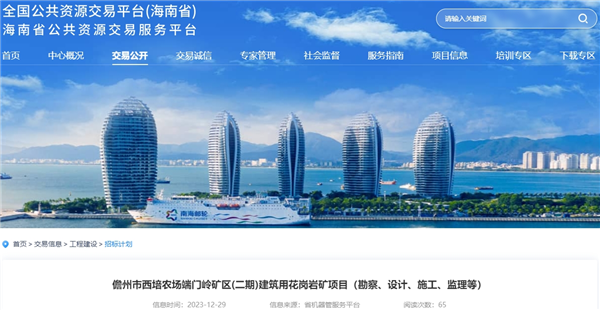 近日,海南省公共資源服務平臺發(fā)布儋州市西培農(nóng)場端門嶺礦區(qū)(二期)建筑用花崗巖礦項目(勘察、設計、施工、監(jiān)理等)招標計劃公告。該項目估算總投資超24億元(243240.39萬元),預計招標時間2024年1月29日。