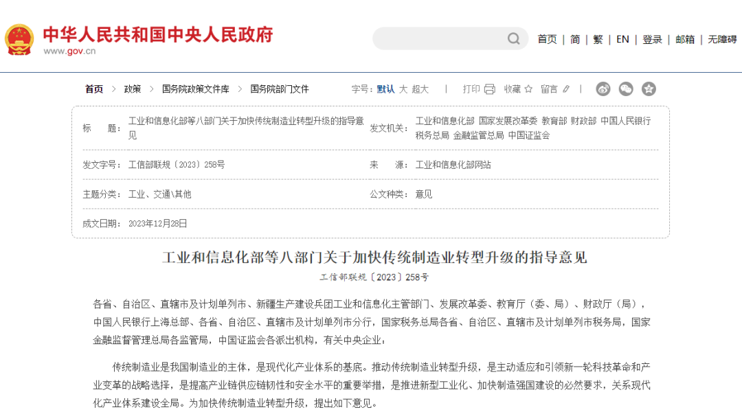 工業(yè)和信息化部等八部門關于加快傳統(tǒng)制造業(yè)轉型升級的指導意見