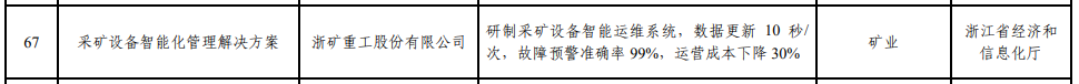 近日,工信部發(fā)布《關(guān)于2023年度智能制造系統(tǒng)解決方案揭榜掛帥項(xiàng)目的公示》。浙礦重工股份有限公司入選2023年度智能制造系統(tǒng)解決方案揭榜掛帥項(xiàng)目名單,揭榜項(xiàng)目為采礦設(shè)備智能化管理解決方案,任務(wù)內(nèi)容為研制采礦設(shè)備智能運(yùn)維系統(tǒng),數(shù)據(jù)更新10秒/次,故障預(yù)警準(zhǔn)確率99%,運(yùn)營(yíng)成本下降30%。