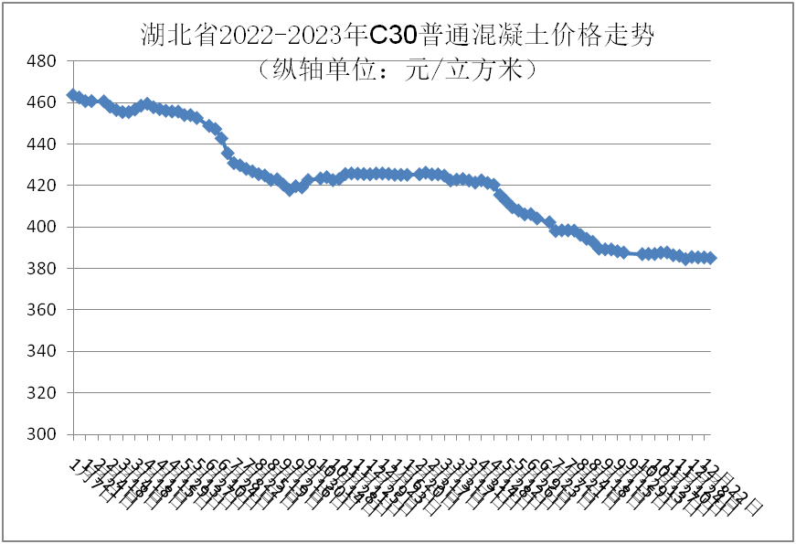 監(jiān)測數(shù)據(jù)顯示:12月份,強(qiáng)度等級C30普通混凝土全省均價為384.98元/立方米,環(huán)比下跌0.47%,同比下跌9.52%。