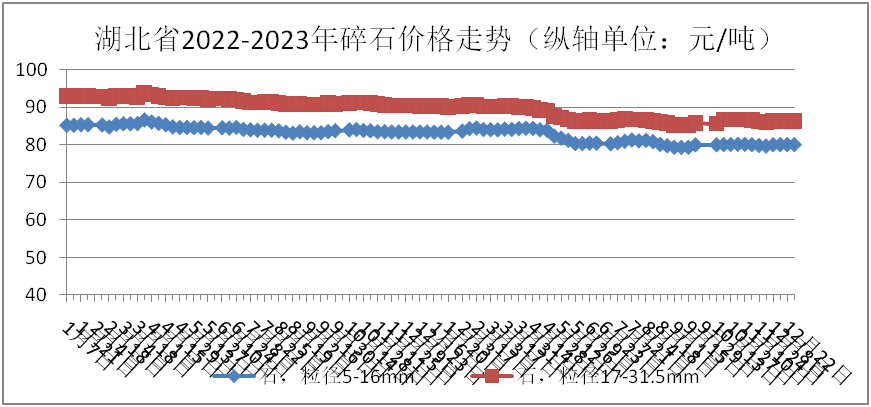 監(jiān)測數(shù)據(jù)顯示:12月份,碎石(粒徑5-16mm)、碎石(粒徑17-31.5mm)全省均價分別為80.02元/噸、86.30元/噸,環(huán)比分別下跌:0.06%、0.35%;同比分別下跌:4.12%和4.54%。具體價格走勢情況如下圖: