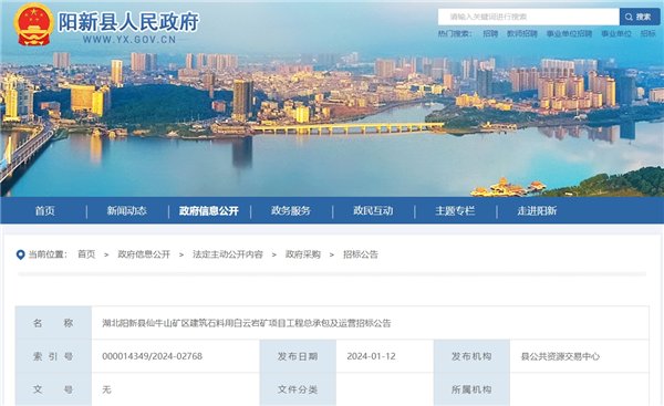 1月12日,湖北省黃石市陽新縣人民政府發(fā)布仙牛山礦區(qū)建筑石料用白云巖礦項目工程總承包及運營項目招標(biāo)公告。據(jù)了解,該項目建設(shè)規(guī)模為500萬噸/年,合同估算價7070萬元,計劃工期(含施工圖設(shè)計)365日歷天,計劃開始工作日期2024年2月20日。投標(biāo)文件遞交截止時間為2024年2月4日9時。招標(biāo)人湖北仙牛山綠色建筑材料有限公司為當(dāng)?shù)貒衅髽I(yè)。