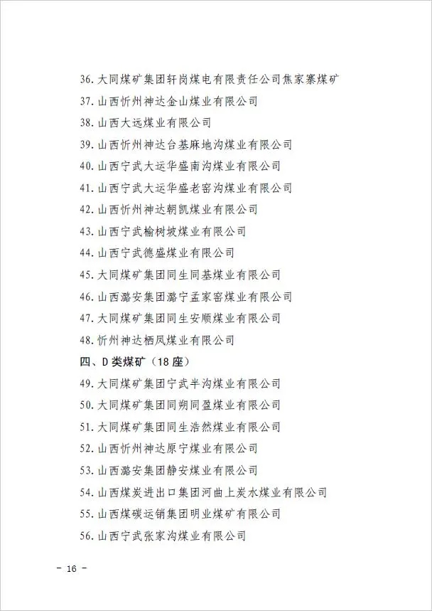 A類煤礦0座,B類煤礦20座,C類煤礦16座,D類煤礦13座。
