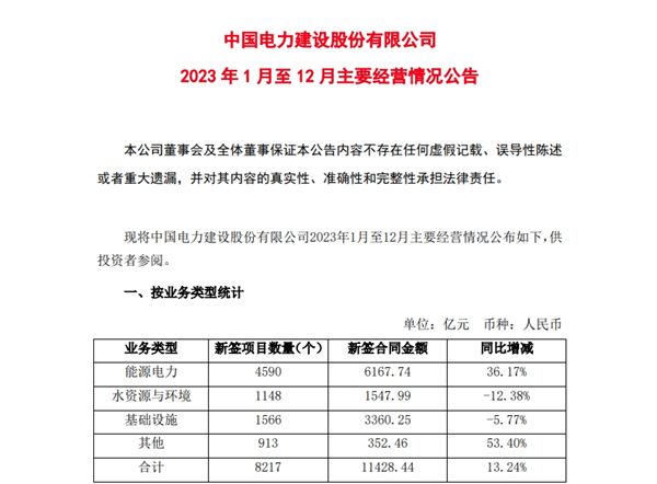 1月25日,砂石儲量近90億噸的中電建公布2023年1月至12月主要經(jīng)營情況。2023年全年,中電建新簽合同金額約1.14萬億(11428.44億元),同比增長13.24%,再次邁入萬億俱樂部。