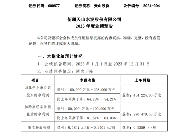 1月26日,新天山水泥發(fā)布業(yè)績預告,預計2023年歸屬于上市公司股東的凈利潤16億元-20.8億元,同比下降54.21%-64.78%。據(jù)了解,新天山水泥骨料資源儲量超過34億噸(其余企業(yè)骨料資源尚未計算,也不包含水泥熟料用礦山資源利用的骨料)。